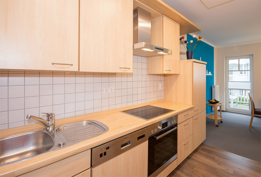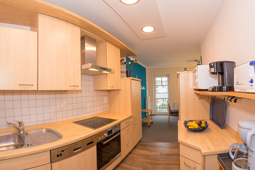 Vollständig eingerichtete Küche mit Toaster, Kaffeemaschine, Wasserkocher und Spülmaschine.