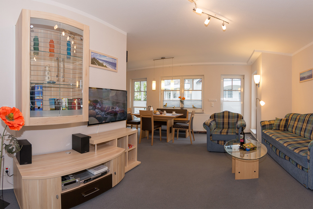 TV-Flachbildschirm mit Kabel-TV und Radio sind vorhanden.